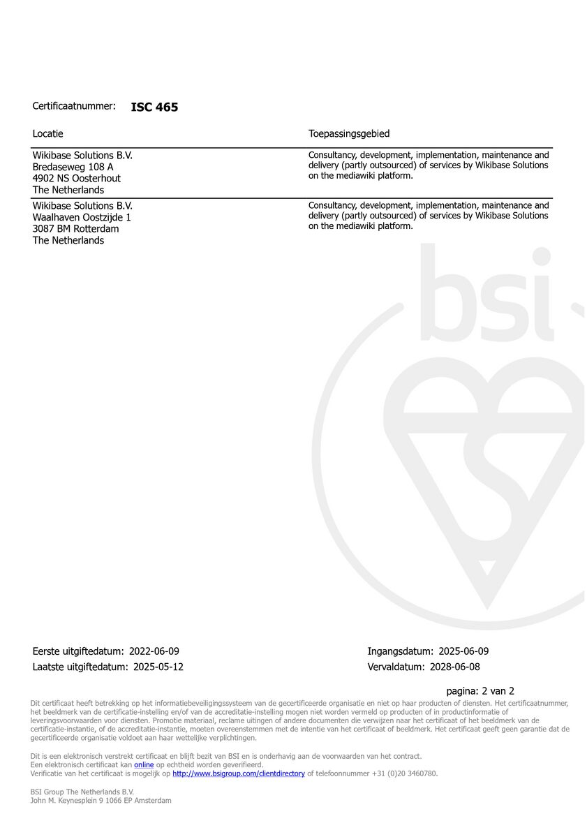 ISO 27001 certificateSince 2022, Wikibase Solutions is certified for information security management systems, by the International Organization for Standardization (ISO). ISO 27001 specifies the requirements for the establishment, implementation, maintenance and continuous improvement of an information security management system (ISMS). It also includes requirements for assessing and treating information security risks, tailored to the needs of the organization. You can validate our ISO 27001 certificate using this link.